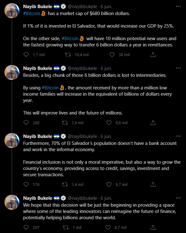 El presidente asegura que el Bitcoin facilitará a los salvadoreños que vivan fuera enviar pagos a casa. “A corto plazo, esto generará puestos de trabajo y ayudará a ofrecer inclusión financiera a miles de personas que no forman parte de la economía formal”, ha declaro Nayib Bukele en una conferencia de Bitcoin en Florida, además de añadir que dará un empujón a la inversión en el país.