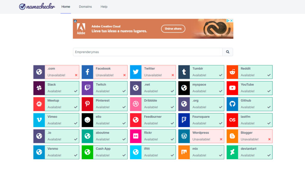 Como lleva mucho tiempo ir comprobando uno a uno cada caso, existen varias webs que se dedican a eso. Ya te presentamos una, Logaster, pero como no suele ser suficiente con hacer una sola comprobación, esta vez te descubrimos una web maravillosa que te ayuda a averiguarlo en solo unos segundos. Se trata de namecheckr , una página creada expresamente para esa labor, que lista prácticamente todas las plataformas y redes sociales que existen, además de los principales dominios, y te dice, de un solo vistazo, si el nombre que has elegido está ya en uso.